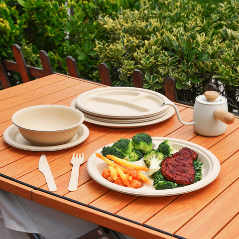 Круглая тарелка из сахарного тростника, одноразовая, экологически чистая пищевая тарелка для ресторанов быстрого питания, кафе